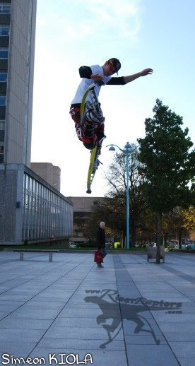 Votre jambe doit être suffisamment haute pour pouvoir la toucher avec votre main. Si ce n'est pas le cas, je vous conseille de vous exercer encore avec la figure de base. Pour toucher le tampon, le mieux est d'avoir un œil qui voit votre échasse. Si elle est de côté, c'est assez simple, si elle est derrière, vous serez obligé de tourner votre buste.
