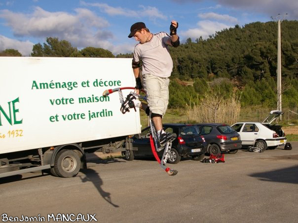 Votre jambe doit être suffisamment haute pour pouvoir la toucher avec votre main. Si ce n'est pas le cas, je vous conseille de vous exercer encore avec la figure de base. Pour toucher la lame, le mieux est d'avoir un œil qui voit votre échasse. Si elle est de côté, c'est assez simple, si elle est derrière, vous serez obligé de tourner votre buste.