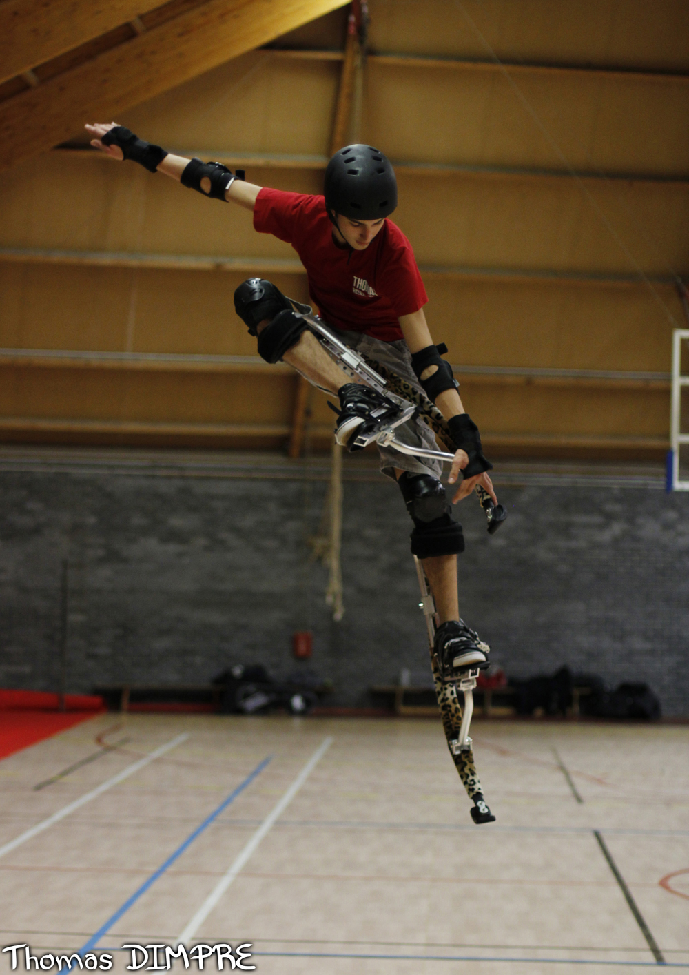 Une des jambes part vers l'avant, fléchie, la partie inférieure de la jambe se soulève pour se rapprocher de la parallèle au sol, tandis que la main vient toucher le tampon.